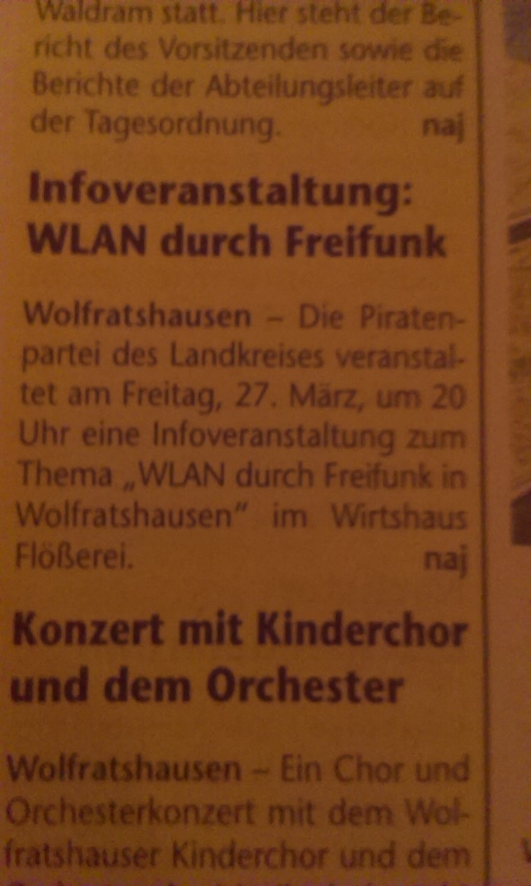 Das war ein guter Infoabend zum Thema freies WLAN mit Freifunk in Wolfratshausen. Wenn auch nicht sehr gut besucht, so ist doch der Ballon gestartet. Bleibt abzuwarten wie das Presse-Echo dazu ausfällt und ob wir dass für weitere Veranstaltungen und Information nutzen können.