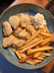 Essen : Putenfilet in Soja-Curry Creme mit Pommes