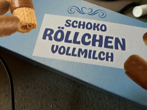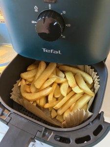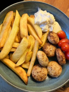 Essen : Geflügelfrikadellen mit Pommes und Tomaten / Schokoröllchen