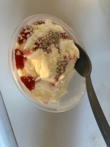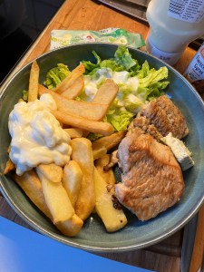 Essen : Putenschnitzel mit Kräuterbutter, Pommes und Salat / Spaghettieis