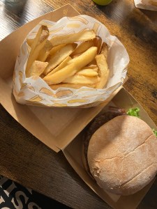 Essen : Burger mit Pommes (Lieferservice)