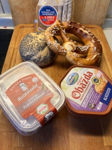 Essen : Brotzeit mit Bretzn, Semmel, Fleischsalat, Salamisticks und Obazda