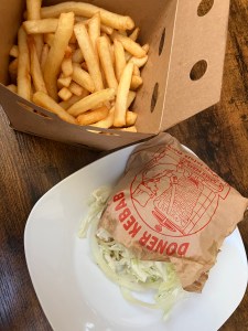 Essen : Döner Deluxe Sandwich mit Putendrehspieß und Pommes (Lieferservice)