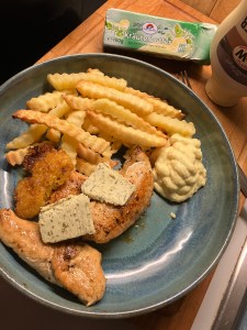 Essen : Hähnchenschnitzel (natur) mit Kräuterbutter und Pommes