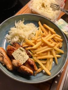 Essen : Putenschnitzel (natur) mit Krautsalat, Pommes und Kräuterbutter