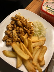 Essen : Gyros von der Pute mit Pommes und Krautsalat
