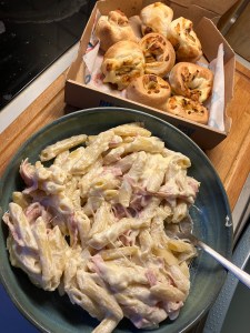 Essen : Penne mit Prosciutto in Käse-Sahnesoße / Pizzabrötchen (Lieferdienst)
