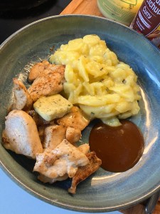 Essen : Hähnchenbrustfilet mit Gemüse in Teriyakisauce und Nudeln